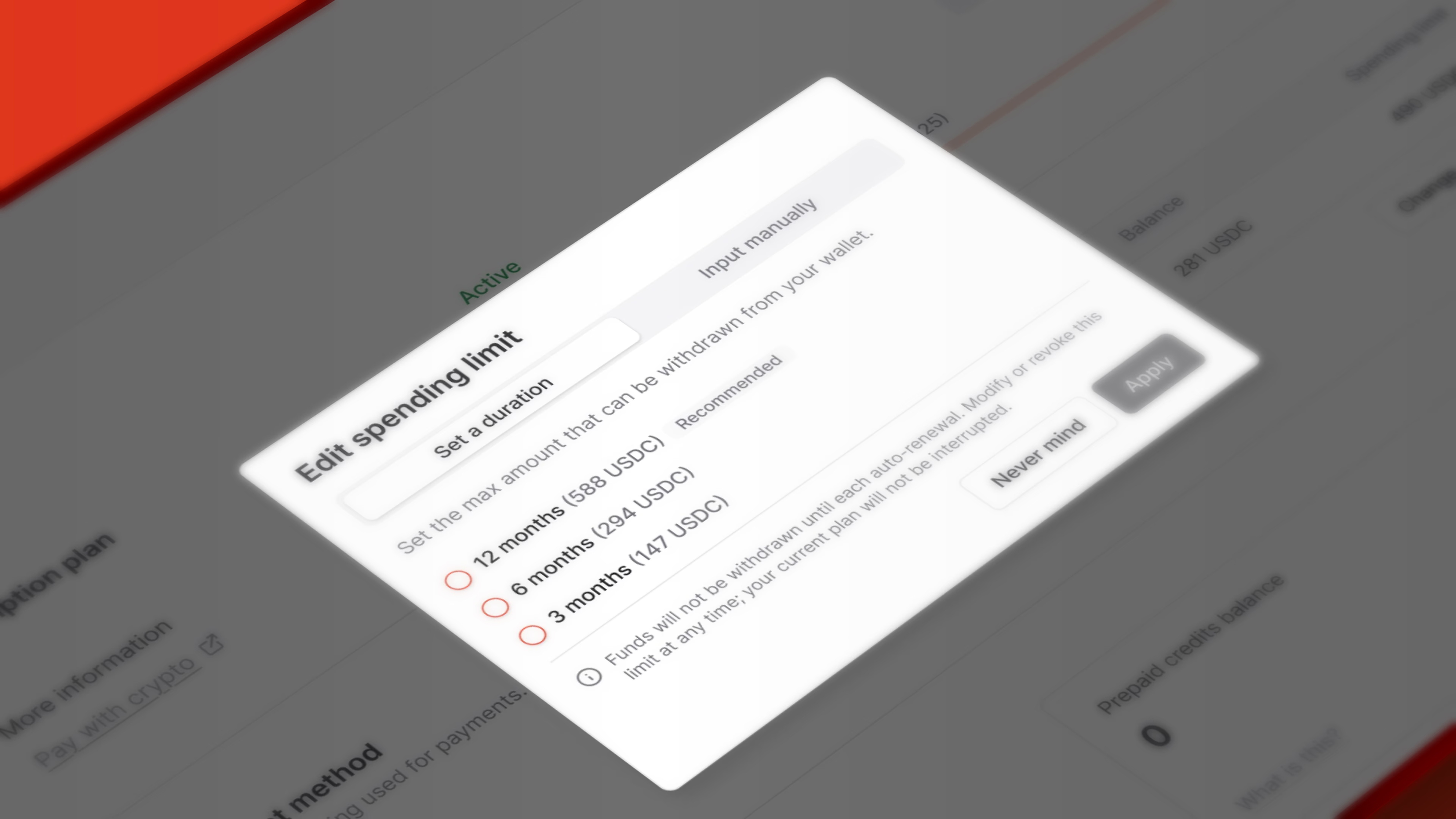 We were building our new billing page when I realized we were asking the wrong question. Instead of asking how much money a dev would like to set for their auth limit - why not lead with a more palatable question around duration?