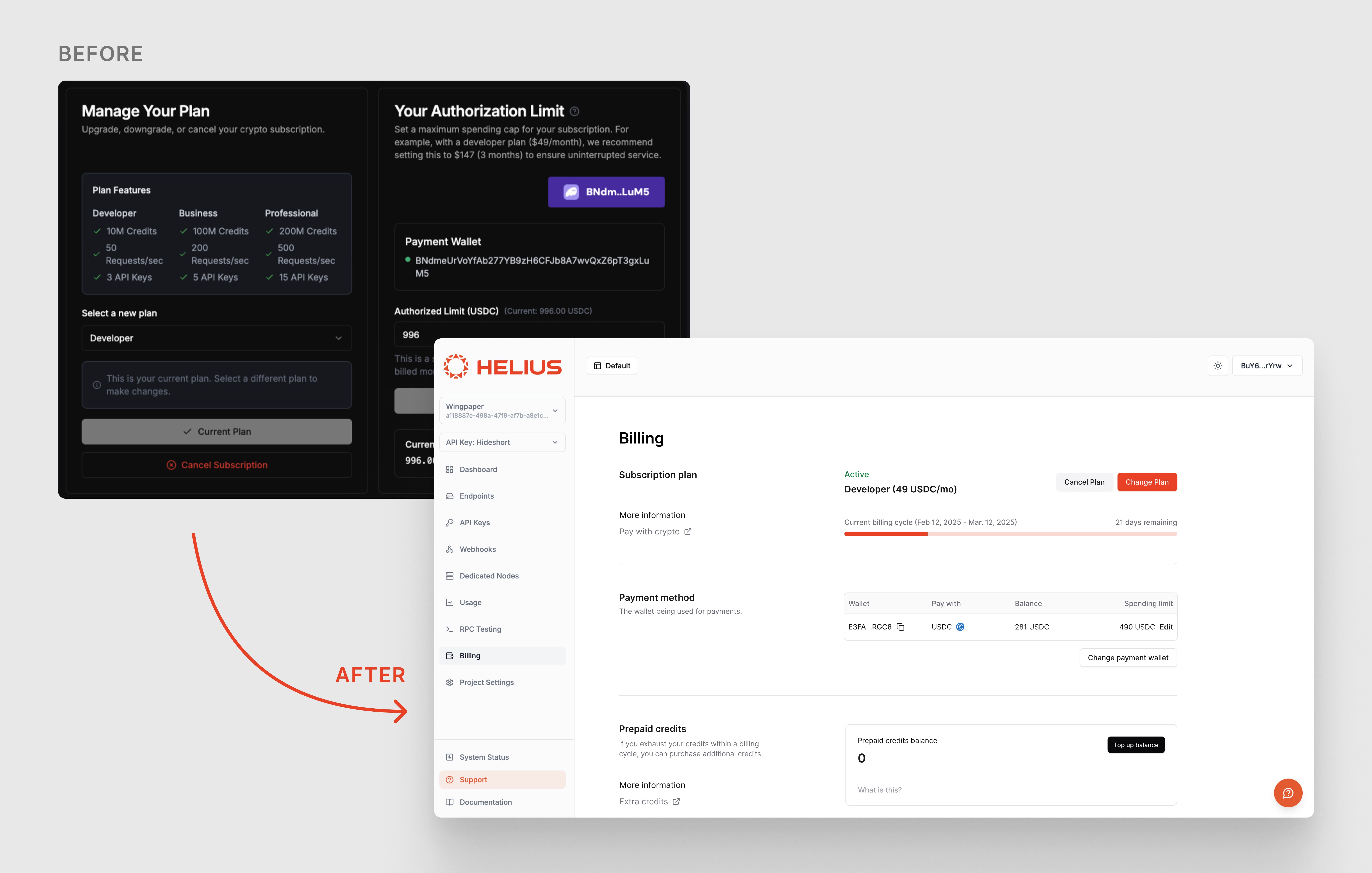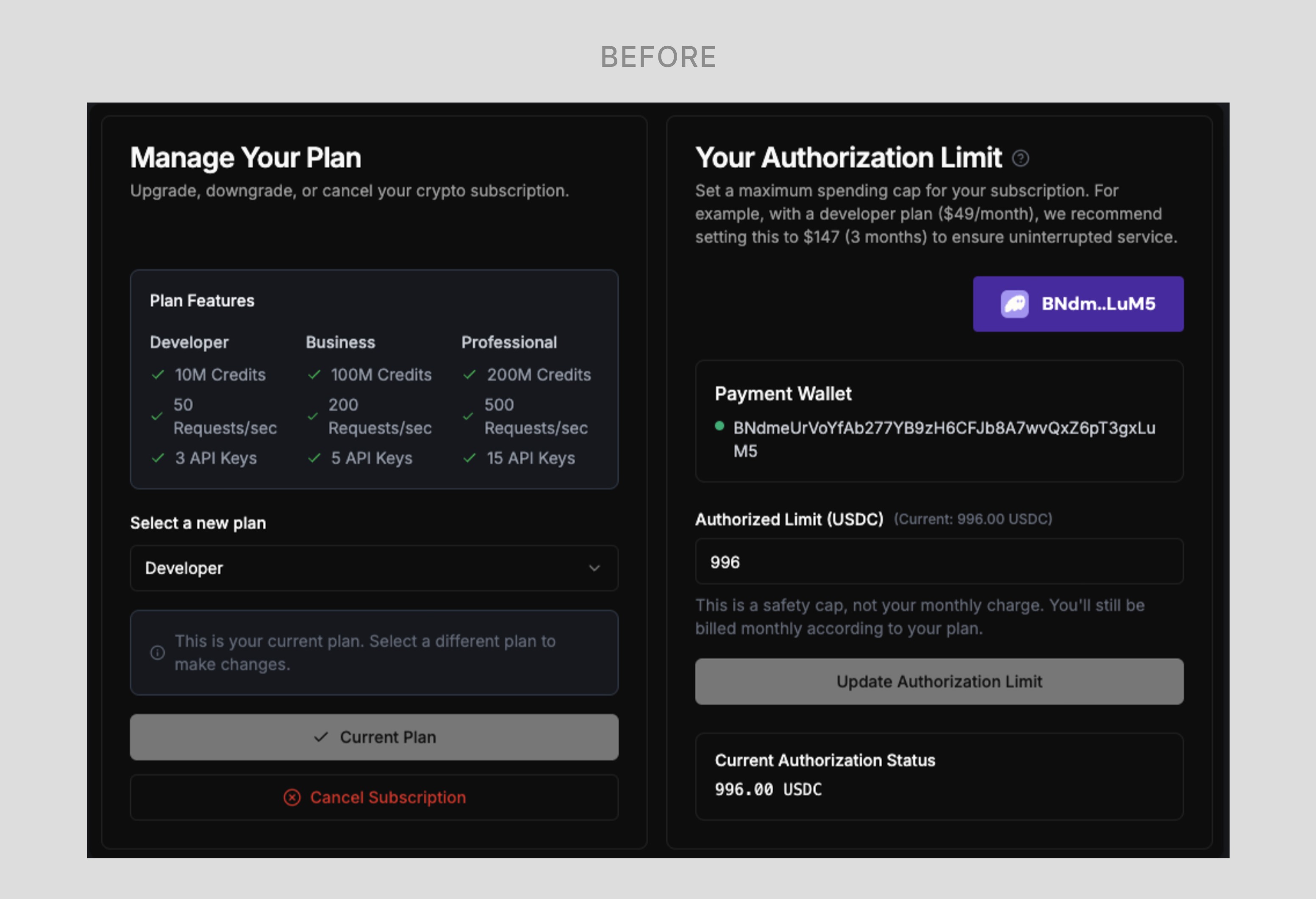 Solving crypto subscriptions was one piece of the puzzle. But to truly reduce support load, we needed to redesign the billing UI where developers managed their spending limits.