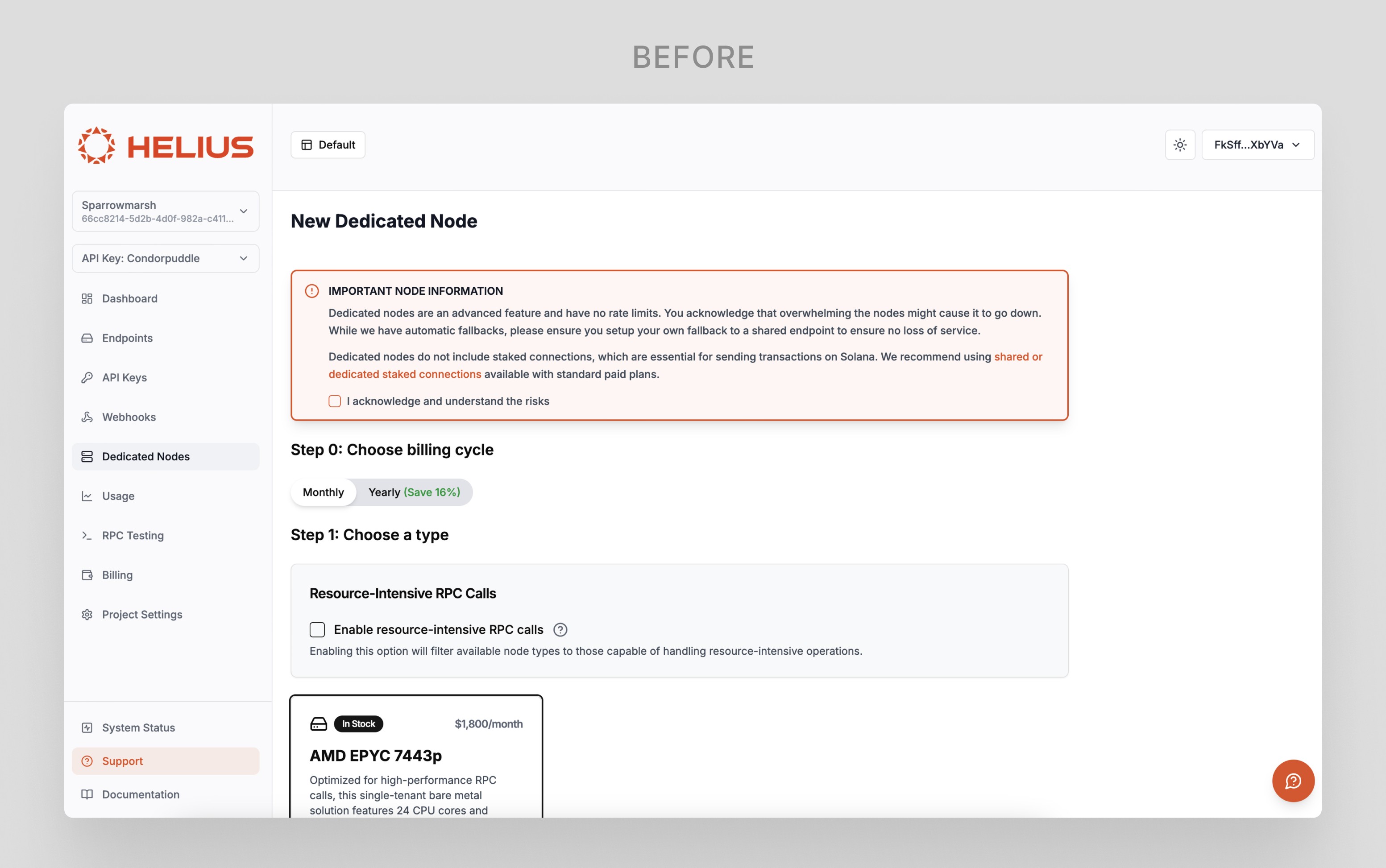 We also needed to help developers avoid overbuying. Many were purchasing dedicated nodes when shared plans would have served them perfectly—and saved them high costs. To do this, I added a banner to draw attention.