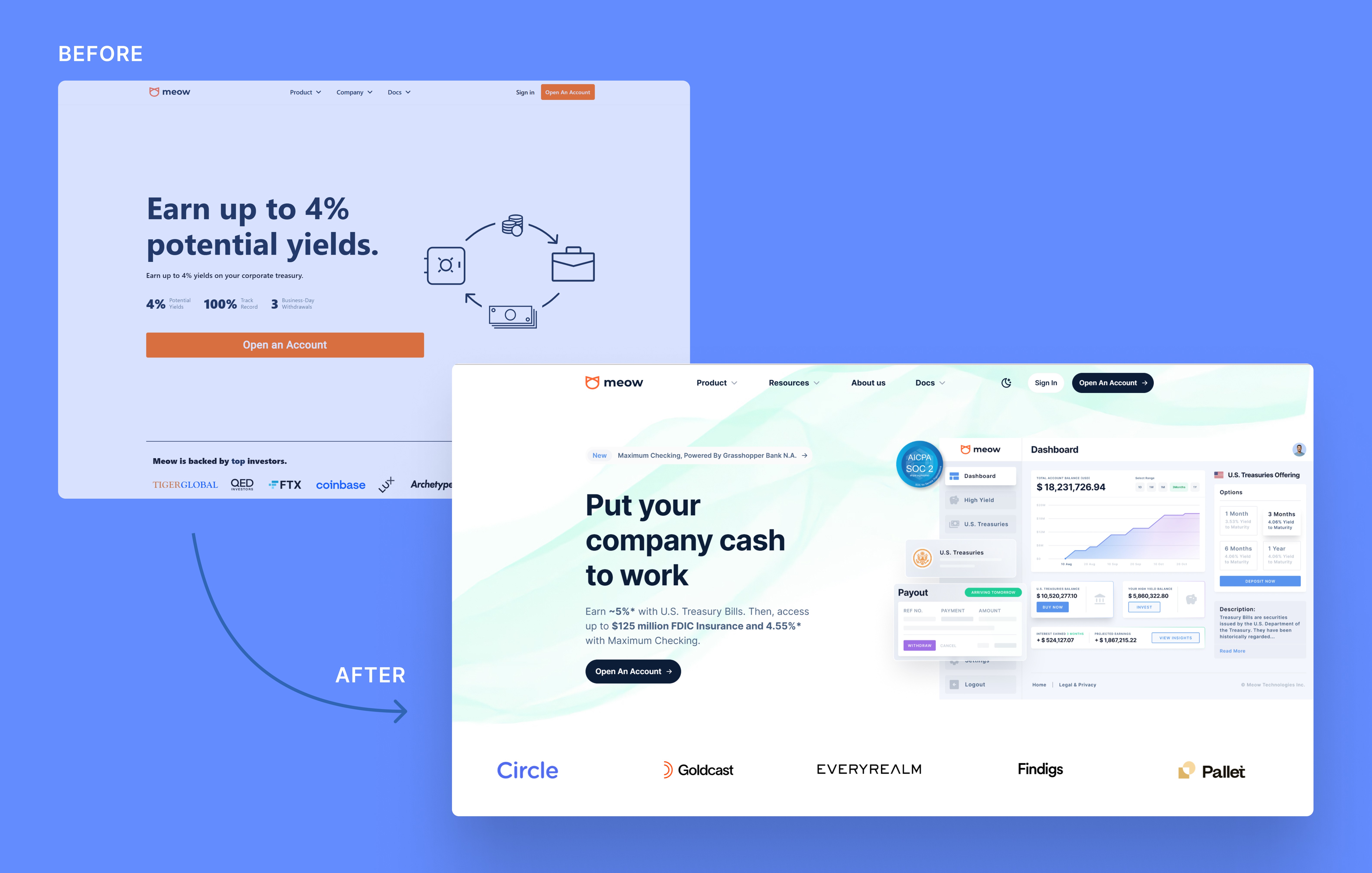 Client: Meow is an enterprise fintech platform managing billions in assets. Recognized in the community as one of the most exciting financial services companies, they've helped clients like Trail of Bits unlock six-figure interest by serving as their primary banking platform.