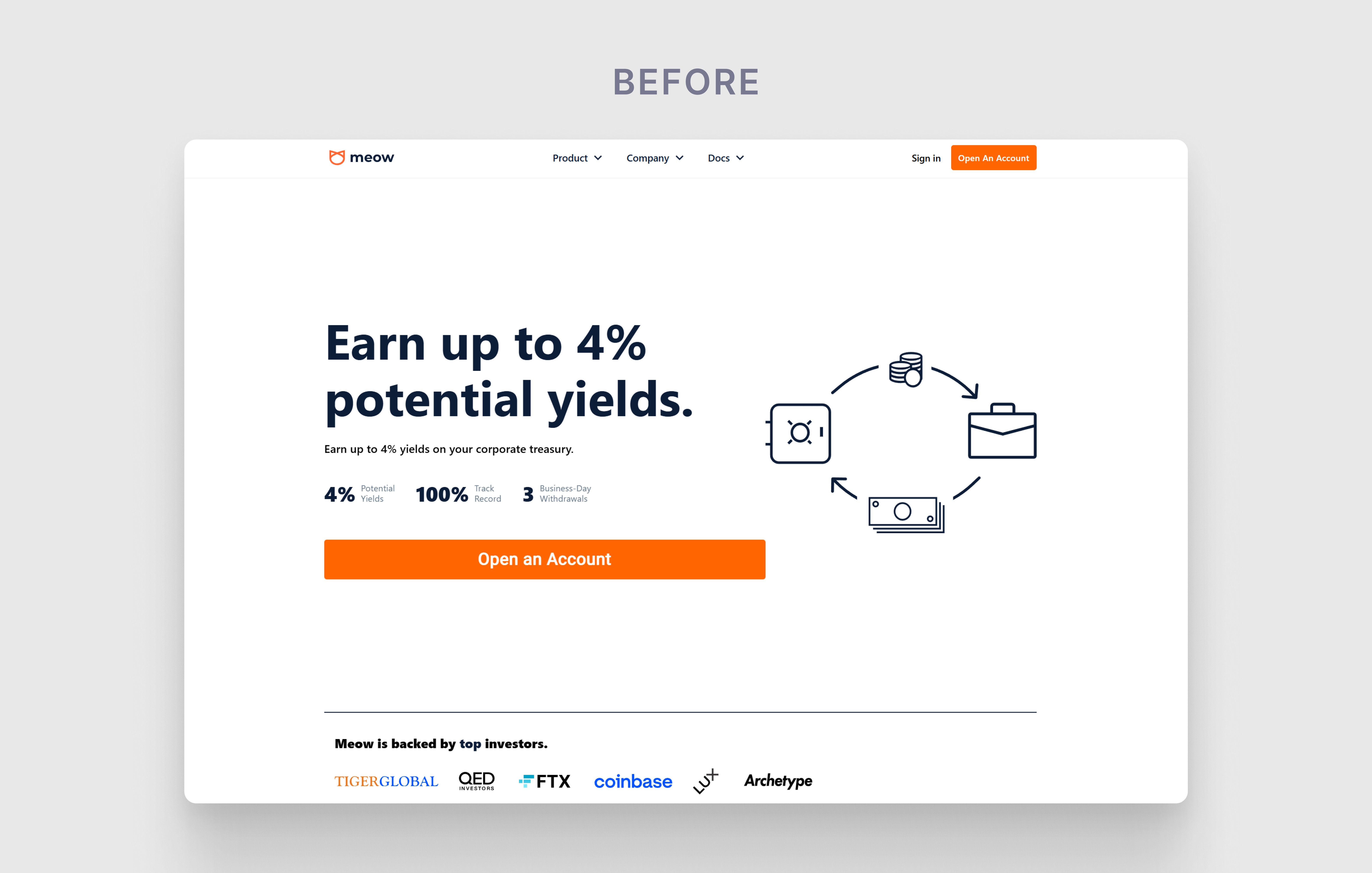 The design felt early-stage. For CFOs and finance teams evaluating treasury solutions, the site lacked the credibility signals that enterprise buyers expect: no visible product UI, limited trust indicators, and positioning that didn't differentiate Meow.